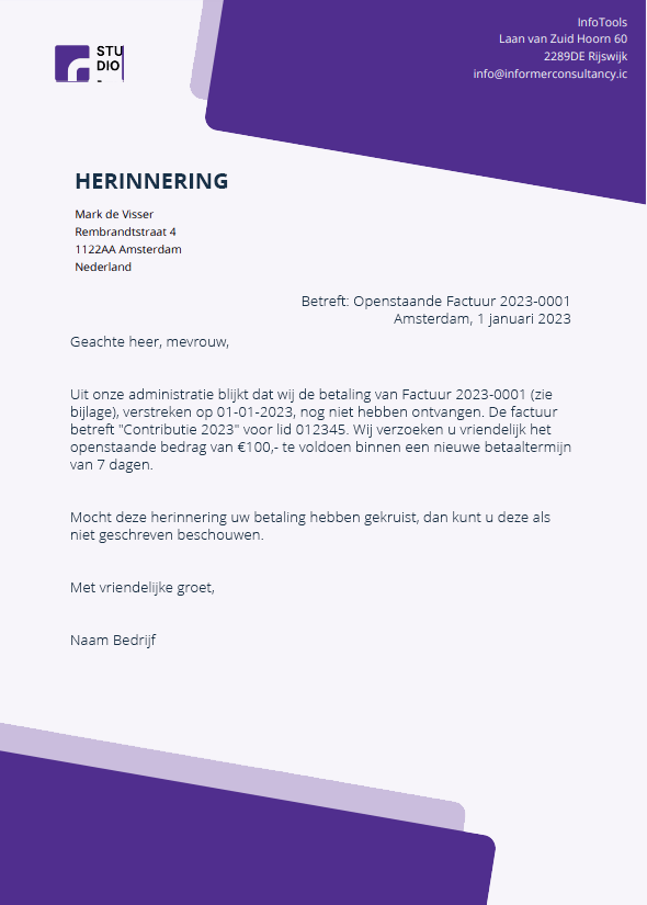 Uit onze administratie blijkt dat wij de betaling van Factuur 2023-0001 (zie bijlage), verstreken op 01-01-2023, nog niet hebben ontvangen. De factuur betreft “Contributie 2023” voor lid 012345. Wij verzoeken u vriendelijk het openstaande bedrag van €100,- te voldoen binnen een nieuwe betaaltermijn van 7 dagen.