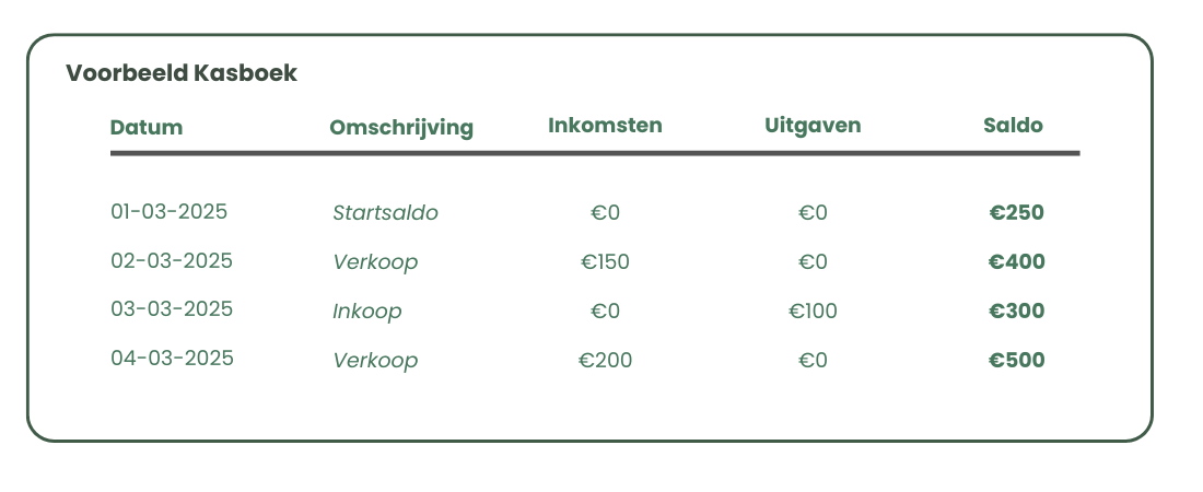 Hieronder vind je een eenvoudig voorbeeld van een kasboek.
