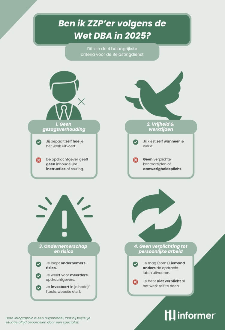 - Zorg voor meerdere opdrachtgevers om geen twijfel over je zelfstandigheid te laten ontstaan.